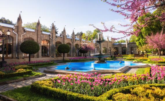 - Посещение Главной Нарзанной галереи - архитектурного памятника XIX века в готическом стиле, выполненного из желтого камня и напоминающего средневековый замок. Ее строгие каменные фасады украшены арками, башенками и остроконечными шпилями. А перед зданием разбит уютный сквер с розовыми клумбами, дорожками, фонтаном и скамейками для отдыха. Внутри галереи, под большим стеклянным куполом, находится колодец с бурлящим целебным нарзаном, а за ним установлены бюветы с разными видами минеральной воды.