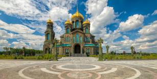 - Осмотр Главного Храма Вооруженных Сил РФ  - это храм в честь Воскресения Христова, посвященный 75-летию Победы в Великой Отечественной войне, а также ратным подвигам русского народа во всех войнах, выпавших на долю нашей страны. Стены храма украшены росписями с батальными сценами из военной истории. Фасады здания отделаны металлом. Отделка нижнего (малого) храма выполнена из керамики и украшена гжельской росписью. Отделка храма, икона и иконостас созданы из меди с эмалями, как это делалось на походных воинских иконах. Своды храма собраны из витражей с изображением орденов, которыми награждали за ратные подвиги в разные периоды истории России. Образ Спаса Нерукотворного в центральном куполе храма - самое большое изображение лика Христа, выполненное в мозаике.